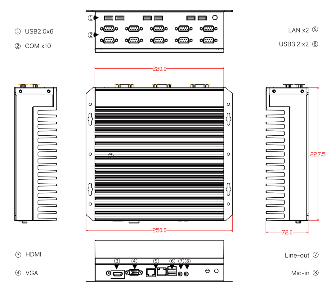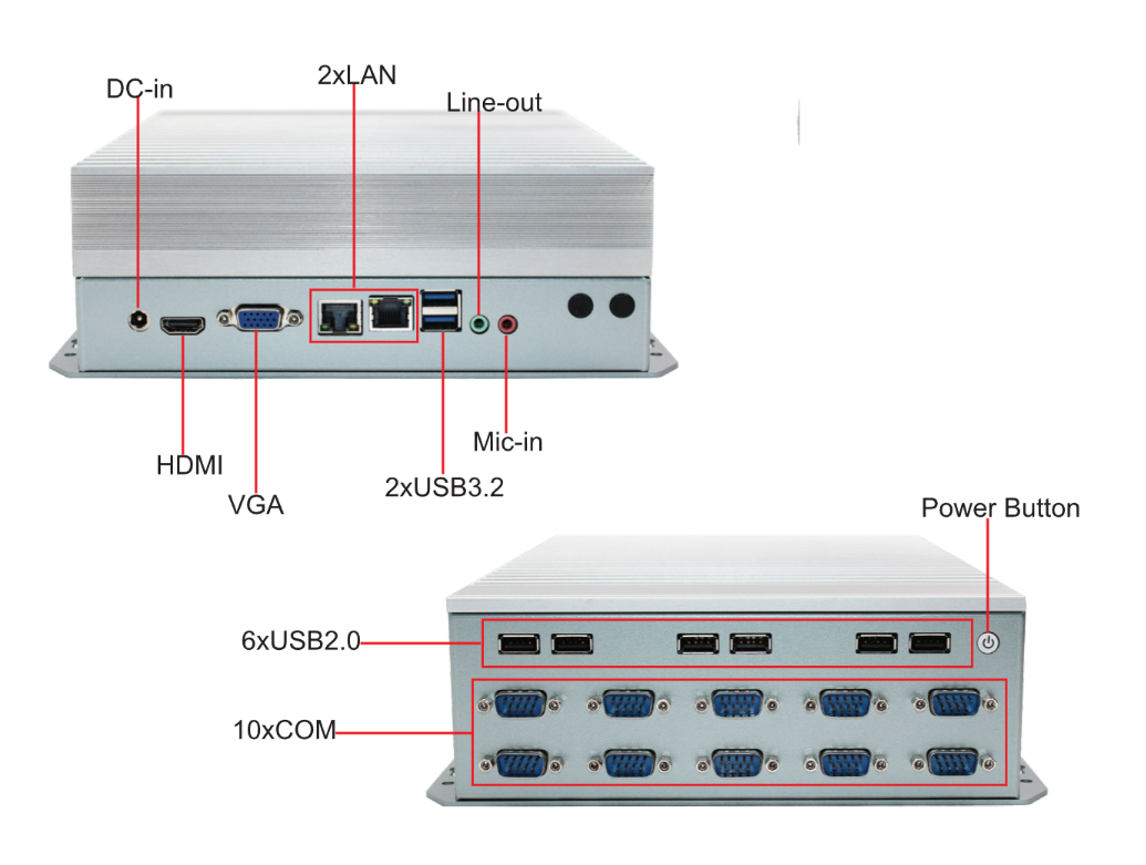 I/O Ports: 2xUSB3.2, 6xUSB2.0. 2xLAN, 10x COM