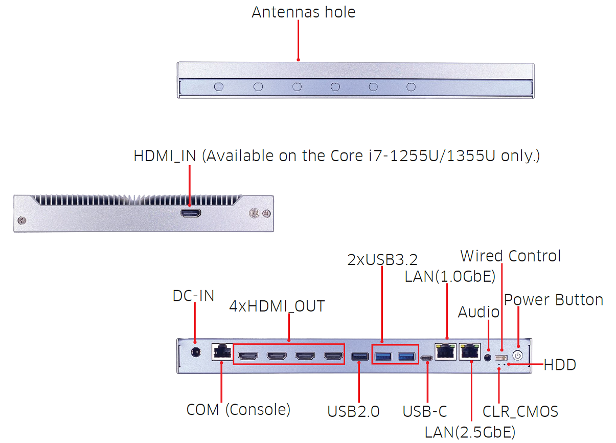 I/O Ports: 2xLAN, 1xCOM, 2xUSB3.2, 1xUSB2.0, 1xUSB-C, SIM, 4xHDMI_OUT, 1xHDMI_IN, Wired Control