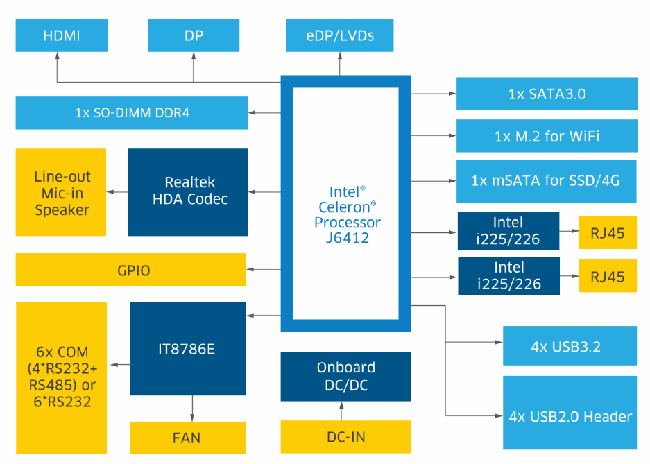 丰富的扩展与接口:具备M.2 WiFi扩展槽、多个COM口和USB接口,以及GPIO和音频接口,满足多样化的连接需求。